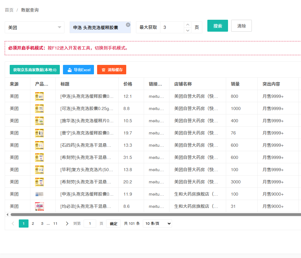 美团查询的时候不清楚最终有多少页数,用户自行设置最大页数进行数据获取。